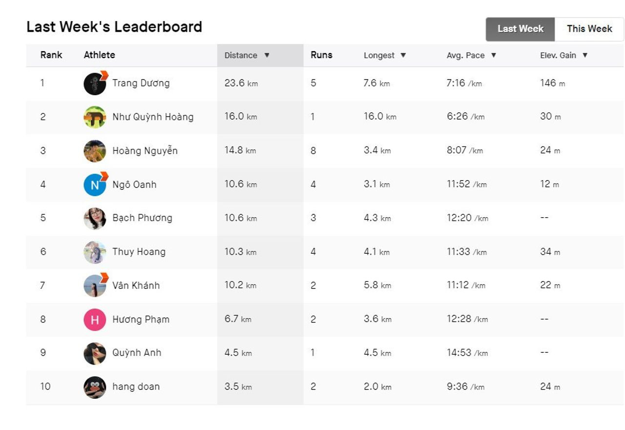 🍀 Hiện tại hàng tuần, công ty đang tổ chức giải chạy (đo bằng app Strava) với quãng đường min là 15km/ tuần.